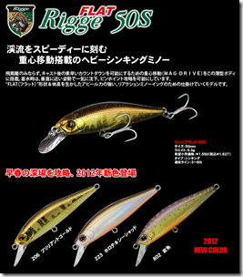 ルアー ジップベイツルアー ジップベイツ:シンキングミノー『リッジ46S』『リッジフラット50S』に新色が追加されます ルアー 2012.02.06 ジップベイツのシンキングミノー『リッジ46S』『リッジフラット50S』に新色が追加されます。 リッジ46S 追加色:ストリームヤマメ リッジフラット50S 追加色:ブリリアントゴールド、ホロテネシーシャッド、岩魚 Rigge46Sに新色登場 Rigge FLAT50Sに新色登場