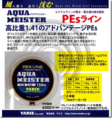 ラインルアー エステルヤリエラインルアー ヤリエ:沈みやすく風に流されにくいエステルライン『アクアマイスター』が発売されます ライン 2015.12.20 ヤリエより、沈みやすく風に流されにくいエステルライン『アクアマイスター』が発売されます。 規格:0.2号、0.3号 長さ:150m 価格:¥6,000 釣具メーカーヤリエ新着情報 【PEsライン】アクアマイスター新商品紹介