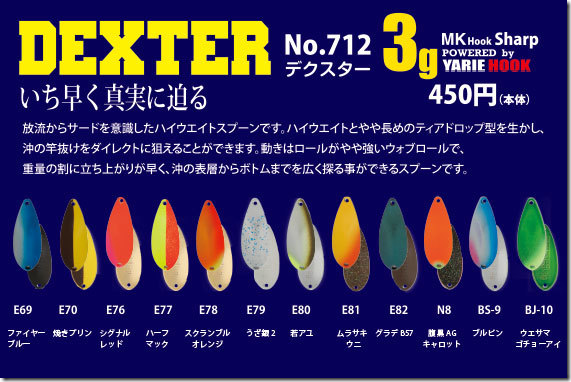 ヤリエより、3gの重めウェイトのエリア用スプーン『NO.712 デクスター』が発売されます。