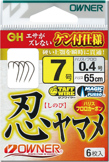 ハリ先が出やすく、しかも1本ケンでズレも少ない。掛かりのよい袖型とバレにくい狐型(長良型)の両方の良さをいいとこどりした形です。忍のようにひっそりとしているのに、忍のように危険で鋭いハリです。価格:¥350