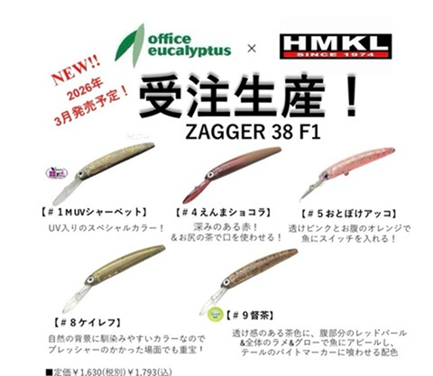 ルアーオフィスユーカリより、HMKL社とのコラボモデル『ZAGGER 38 F1』が受注生産で発売されます。