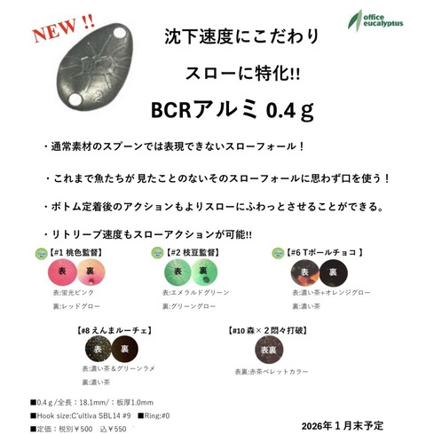 ルアーオフィスユーカリより、トラウトエリア用スプーン『BCRアルミ0.4g』が発売されます。