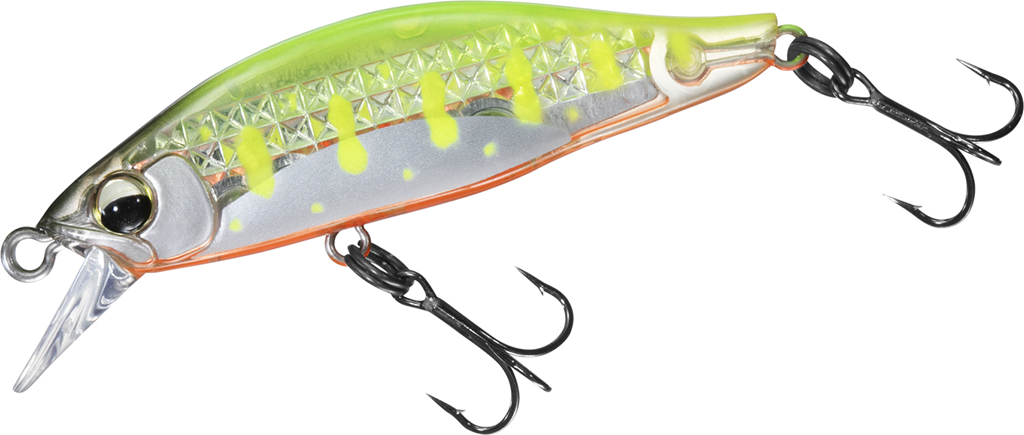 さらに、アクション時のフラッシングを最大化させるべく、側面には3列のレーザーインパクトを配列。光量が少ない山奥のような環境下でも確実に太陽光を捉えて反射する。岩陰や流れに潜む鱒へのアピール力を確保しているだけでなく、アングラーからは輝きでルアーを目視しながらのルアー操作が可能となる。サイズ:50mm