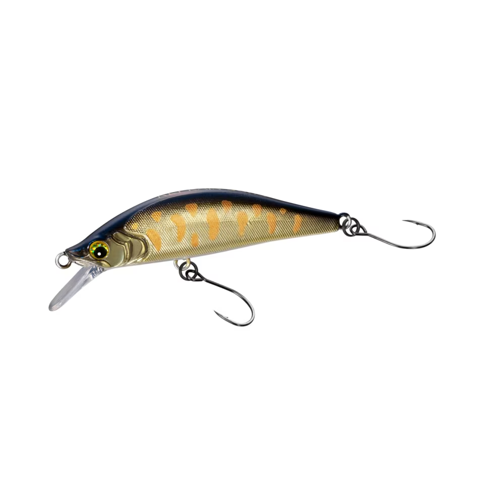 基本アクションはローリング。タングステンウェイトを最下部に設定し、強い流れや逆引きでのトゥイッチ時でも、安定した泳ぎと、明滅がトラウトを誘惑します。ほんの少しの後方重心で、飛距離やキャスタビリティを犠牲にせず、テンションフォールではシミーフォール。着水後にトラウトに見切られにくい沈降姿勢です。オススメはアップでやや竿を立てたショートトゥイッチ。レスポンス良く、小気味よい操作感でミノーゲームを楽しめます。