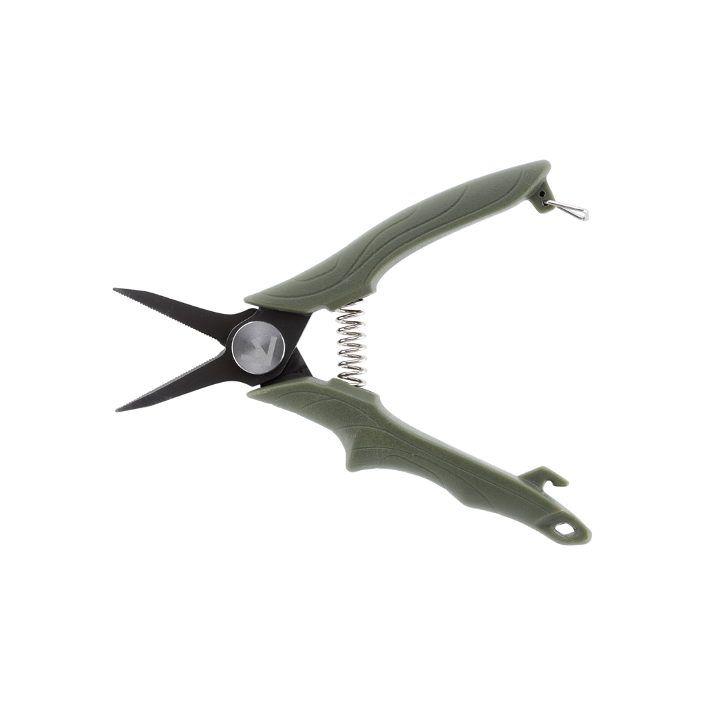 細かい作業に向いている、先の鋭いコンパクトシザース。ブラックカラーと自然に溶け込みやすいグリーンカラーをラインナップ。PEラインもスパスパカットできるシャープな切れ味が特徴。
