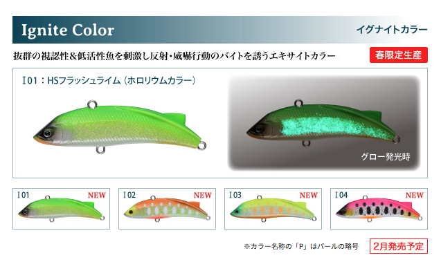 スプリーモのトラウト用バイブレーション『ヴィヴォーノ60H/60L』に新色『イグナイトカラー』が追加されます。