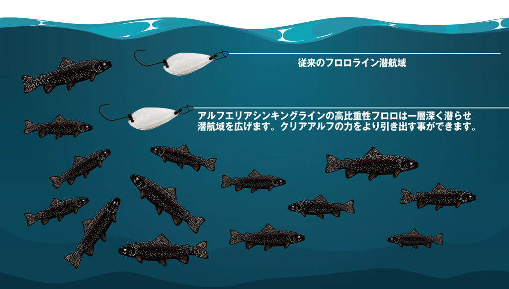 ✔︎高比重のフロロカーボンでクリアアルフを一層沈めて、リトリーブの有効範囲を広げます。