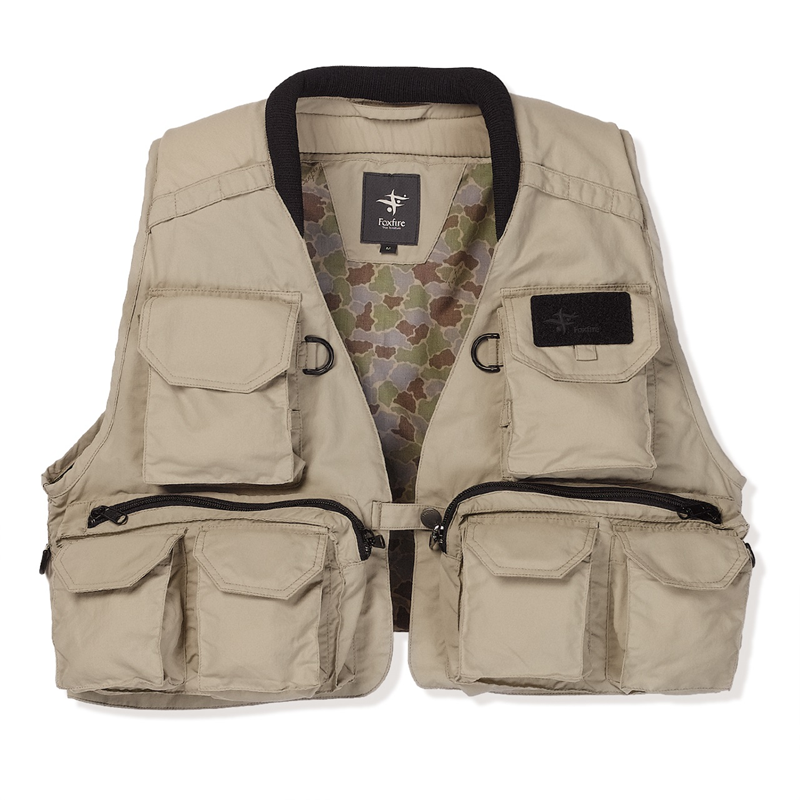 ベーシックな横型ポケットレイアウトのフィッシングベスト。ルアー、フライ問わず、様々なサイズのボックスを効率的に収納できます。左右の内ポケットには多少厚みのある物でも出し入れしやすい袋状のポケットを採用。また左身頃の内側下部にはラインの切れ端などを入れられるダストポケットを設けました。40年以上に渡るベスト製作で培ってきた荷重分散に優れたパターンを採用し、体への負担を軽減。後ろ身頃の裏地にはFoxfireオリジナルのフィッシュアイカモフラージュ柄を配し、ブランドのオリジンであるフィッシングベストを彷彿とさせるデザインでありながら、現代のフィールドにおいても第一線で活躍する機能的なベストです。
