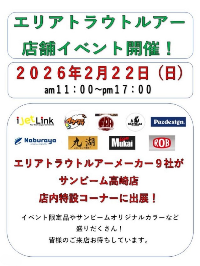 イベント情報2/22 群馬県高崎市 サンビーム高崎店にてエリアトラウトルアーイベントが開催されます。