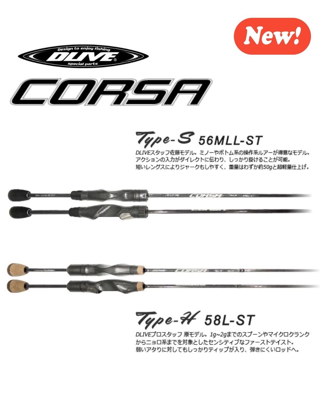 DLIVEより、トラウトエリア用ルアーロッド『DLIVE CORSA Type-S 56MLL-ST』『DLIVE CORSA Type-H 58L-ST』が発売されます。