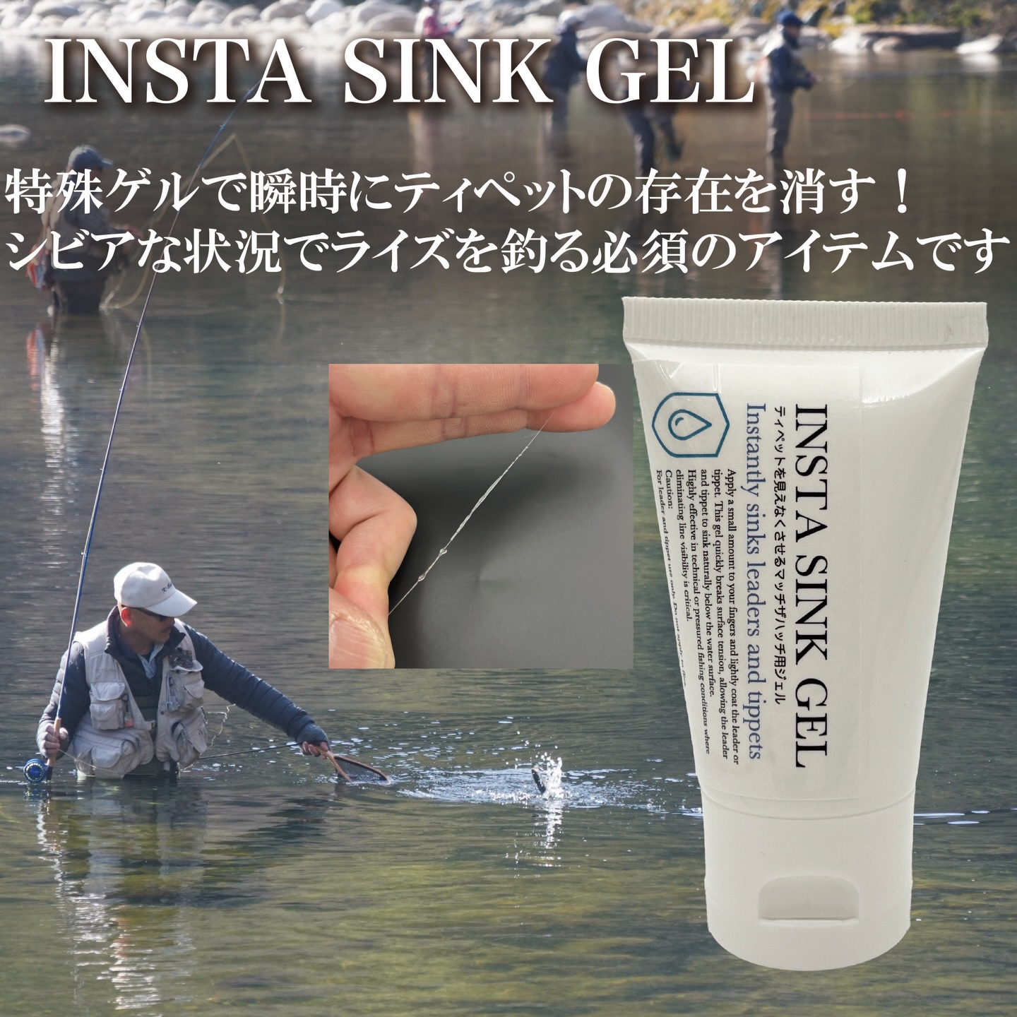 インスタシンクジェルは高粘度のゲルです。ティペットについた特殊ゲルがキャスト後でも剥がれにくく効果は抜群!