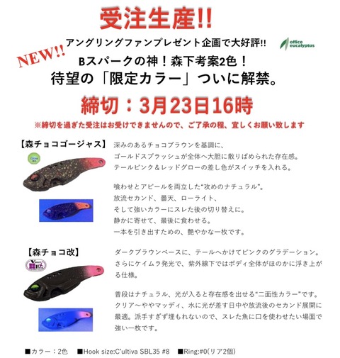 アングリングファンプレゼント企画で大好評!!Bスパークの神!森下考案2色✨