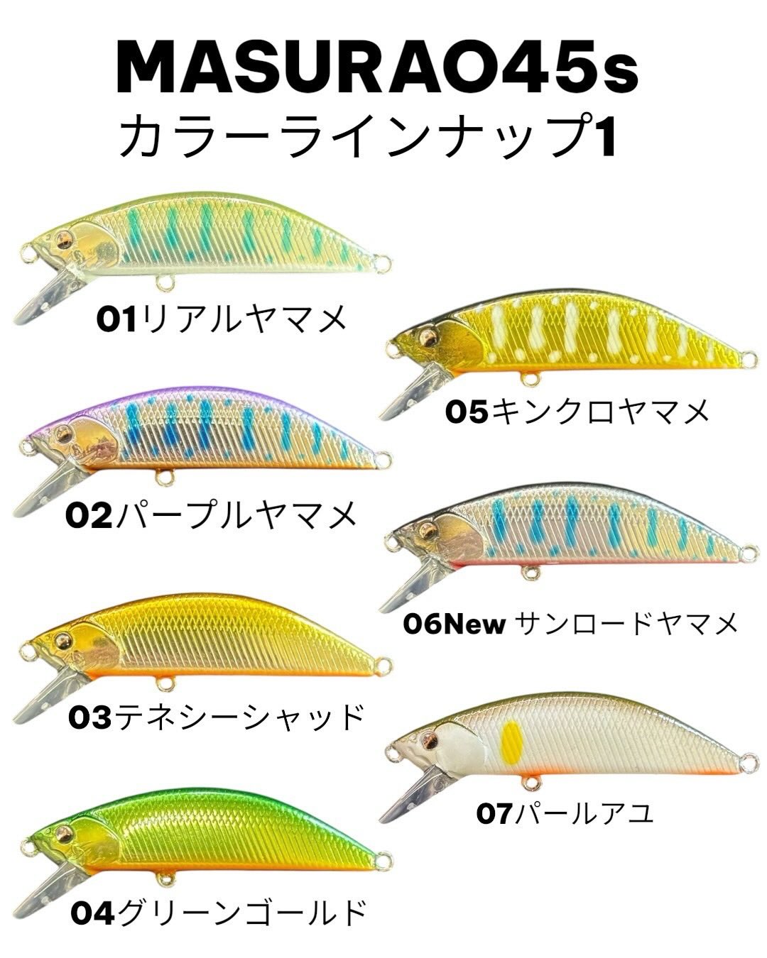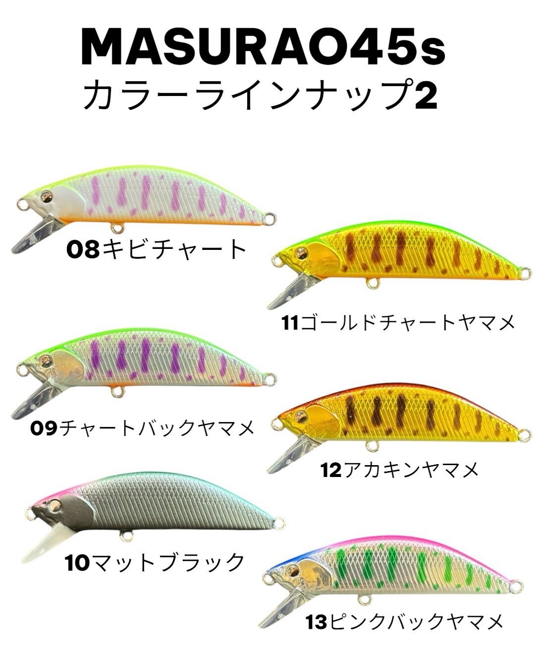 hook:#12動の釣りから静の釣りまで、アングラーの意のままに昨今のセンシティブなトラウトを攻略する攻撃的シンキングミノー『MASURAO45s』。小渓流のみならず中本流域での使用も想定し設計。アップストリーム、ダウンストリームにも適応する遊泳力の高さと抜群のキャストフィールを追求。小粒のボディからは想像できないハイアピールな平打ちアクション、水平姿勢を保ちながらドリフトやフォールアクションでオートマチックにバイトを誘発します。